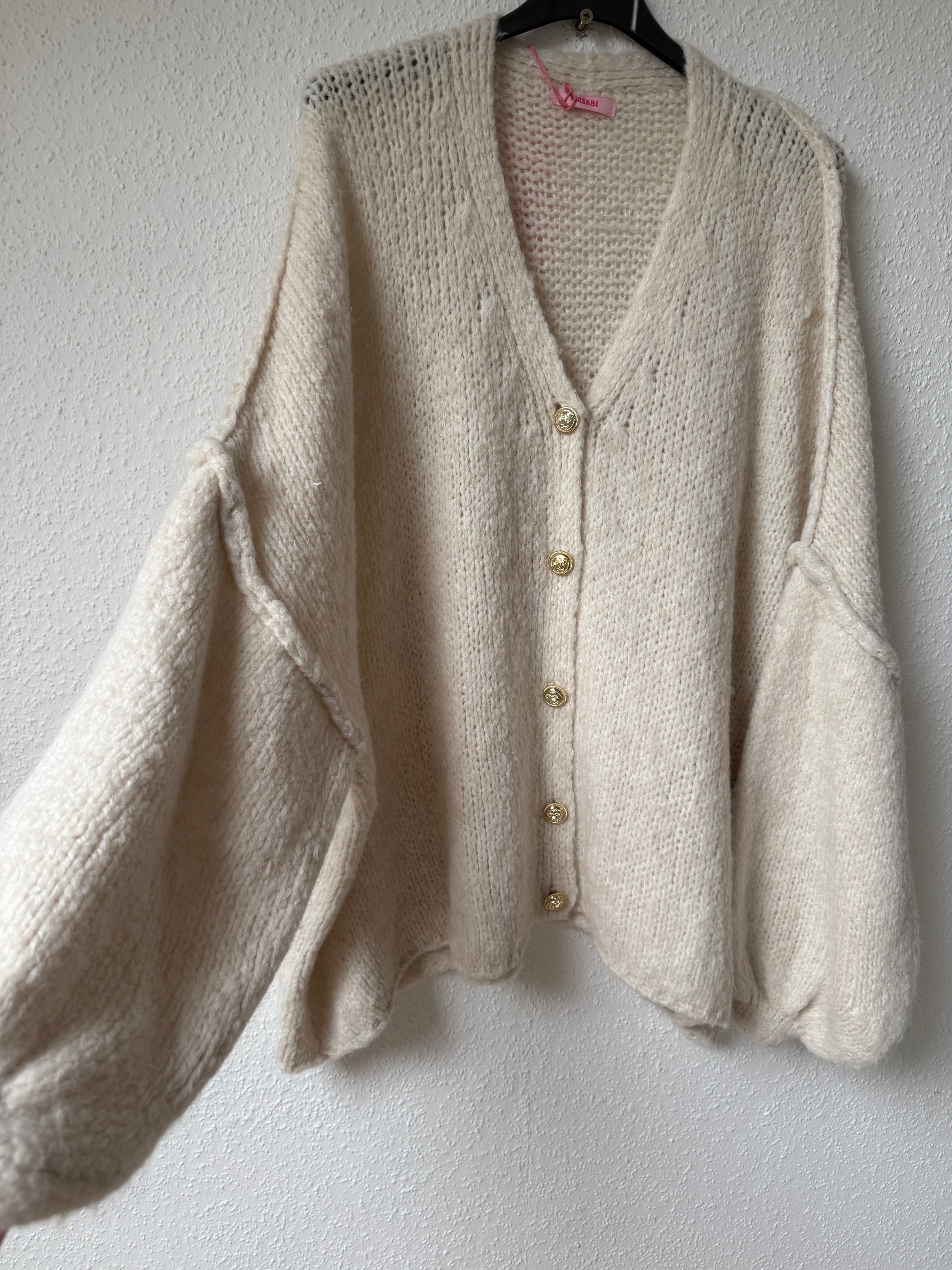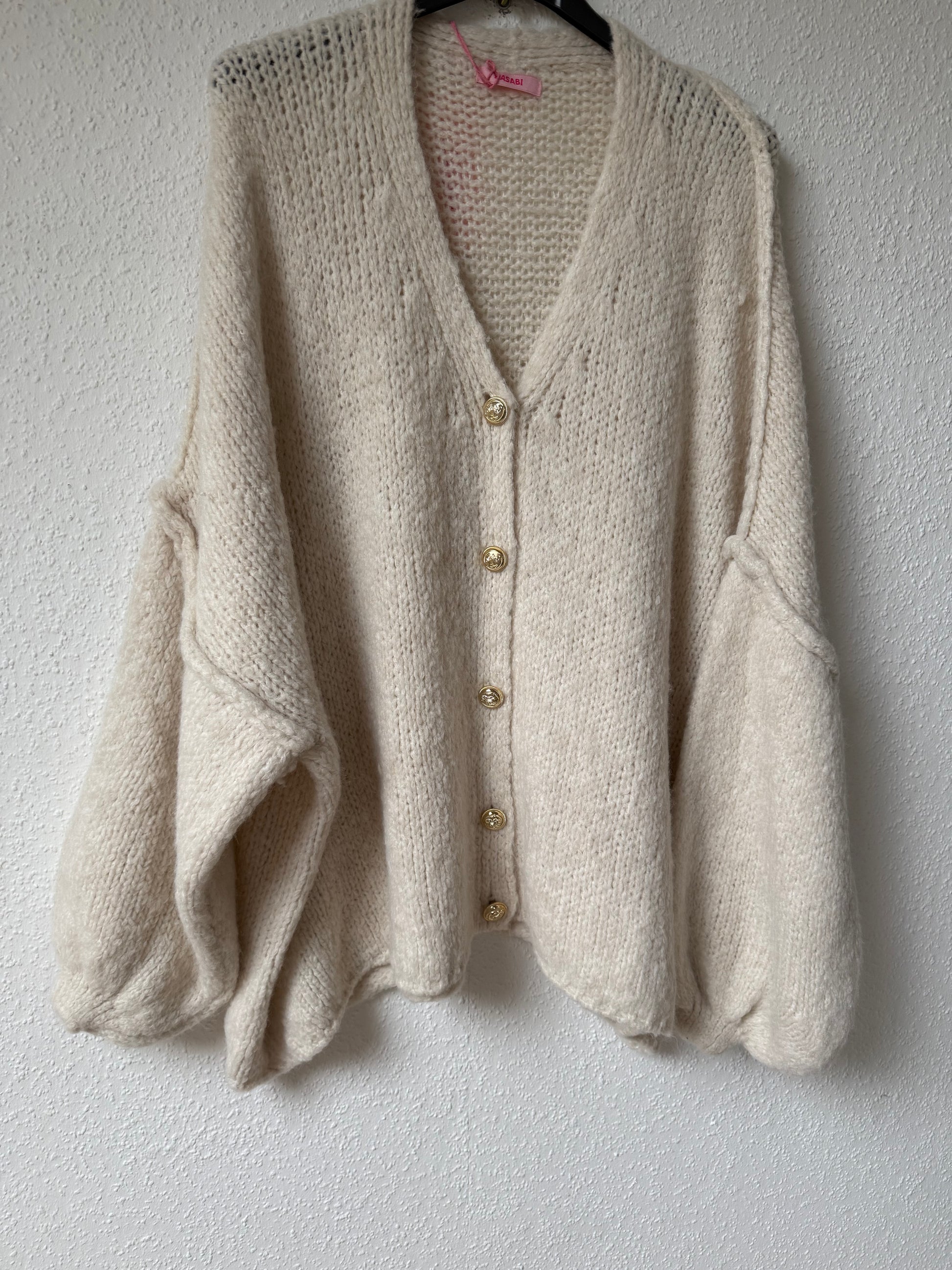 Lange oversize Strickjacke mit goldenen Knöpfen.